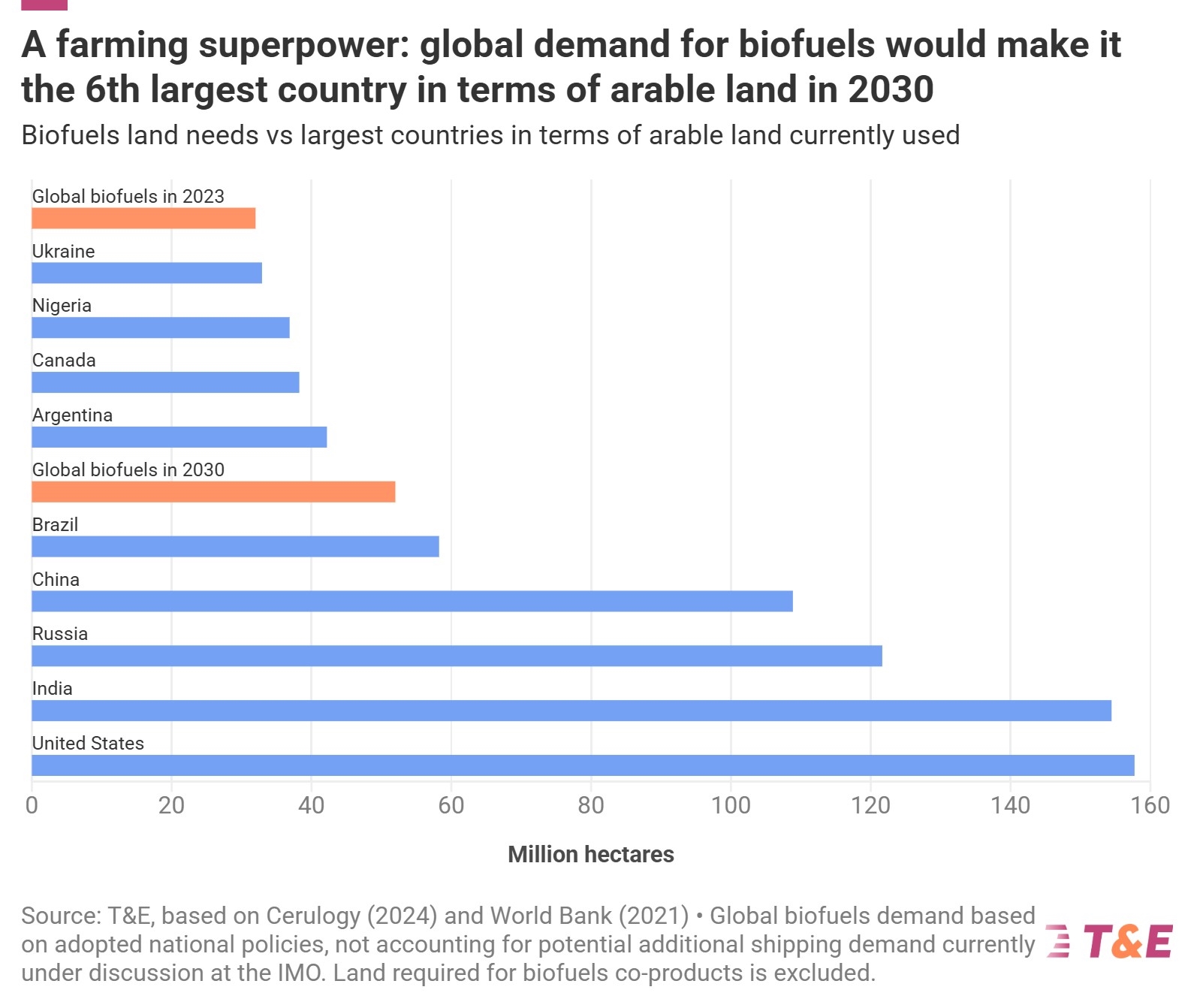 Günümüzde yakıt olarak kullanılacak mahsul yetiştirmek için 32 milyon hektarlık alan kullanılıyor. Bu da yaklaşık İtalya büyüklüğünde bir alan. 2030 yılında ise bu rakamın %60 artarak 52 milyon hektara, yani Fransa’nın yüzölçümüne ulaşması bekleniyor. Bu alan kullanımına rağmen, biyoyakıtlar dünya ulaşım talebinin yalnızca %4’ünü karşılıyor. Bu alanın yalnızca %3’ü güneş panelleriyle kaplanırsa aynı miktarda enerji üretmek mümkün. Elektrikli araçlar fosil yakıtlı araçlardan çok daha verimli olduğundan, bu kadar küçük bir alandan üretilen enerji, dünyadaki tüm araçların elektrikli olduğu durumda üçte birine yetecek enerjiyi sağlayabiliyor.